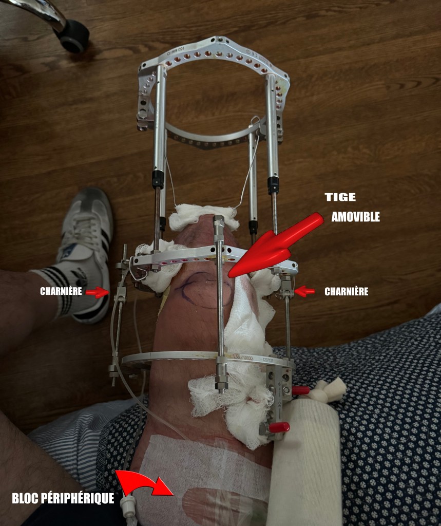 Une vis stoppeuse me permet de contrôler ce mouvement : je la retire plusieurs fois par jour pour plier et déplier la jambe. Mes muscles sont très fragilisés, douloureux, mais je progresse doucement. Un physiothérapeute viendra bientôt me superviser et m’aider à intégrer d’autres traitements adaptés.