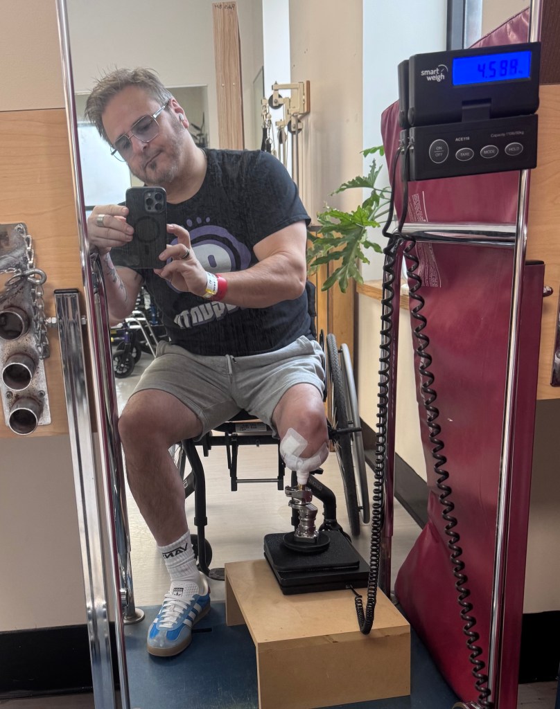 En ce moment, je traverse une phase charnière, fragile, presque suspendue. Depuis la mi-janvier, je dois faire une mise en charge progressive sur ma tige. J’ai commencé à 5 kg, deux fois par jour, et tous les deux jours, j’ajoute 5 kg, comme on poserait une pierre de plus sur une structure encore neuve. Aujourd’hui, je suis rendu à 40 kg. Étant amputé très court, même avec l’allongement d’environ un pouce, je reste un candidat à risque. Rien n’est banal ici. Chaque palier est une petite victoire, mais aussi une zone à franchir avec prudence.