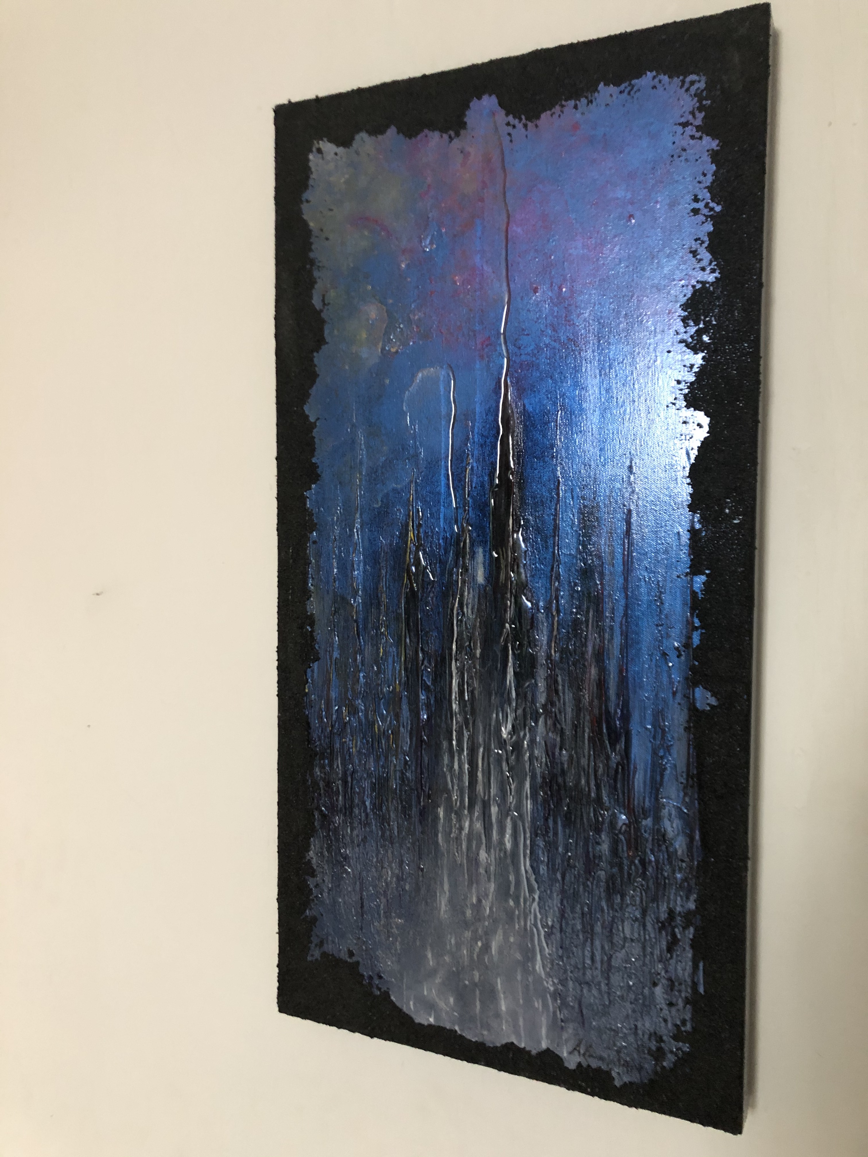 Tableau d’art intuitif moderne, avec accent bleu métallique. Utilisation de plusieurs techniques, couteaux et pinceaux. Beaucoup de transparence, idéal dans un décor industriel, moderne.